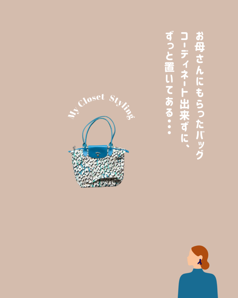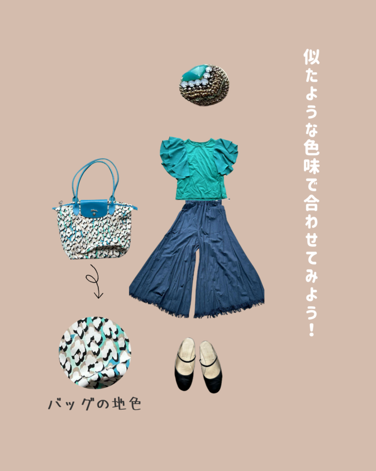 お手持ちのお洋服から、バッグの地色に近い色を選びました。